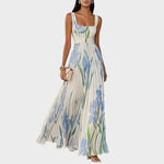 Dolga cvetna plisirana obleka združuje romantiko in prefinjenost v enem kosu. S kvadratnim izrezom in širokimi naramnicami, ki poudarijo dekolte, ter definiranim pasom, ki oblikuje postavo, je ta obleka prava izbira za vsako priložnost.