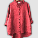 Elegantna lanena bluzica, ki združuje preprostost in brezčasni slog. V-izrez z subtilnim naborkom doda ženstven detajl, medtem ko sproščen kroj nudi udobje čez ves dan. Asimetričen rob z daljšim hrbtom dopolnjuje moderno, a hkrati elegantno izbiro za vsako priložnost.