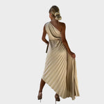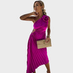 Naša obleka s naborki na ramenih prinaša sofisticiran in glamurozen videz, idealna za posebne priložnosti, ko želite izstopati.