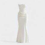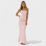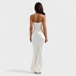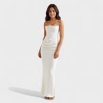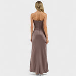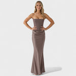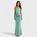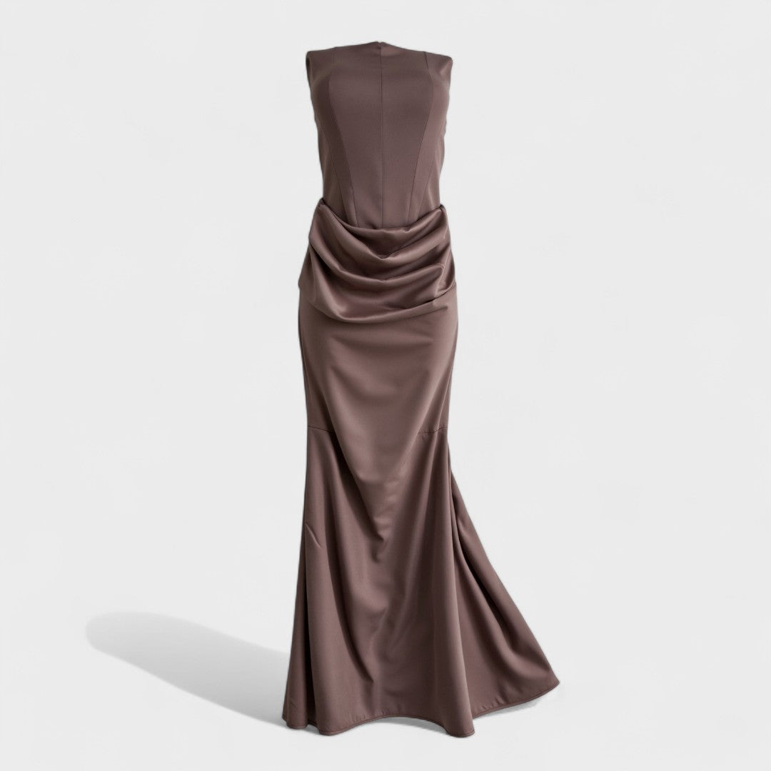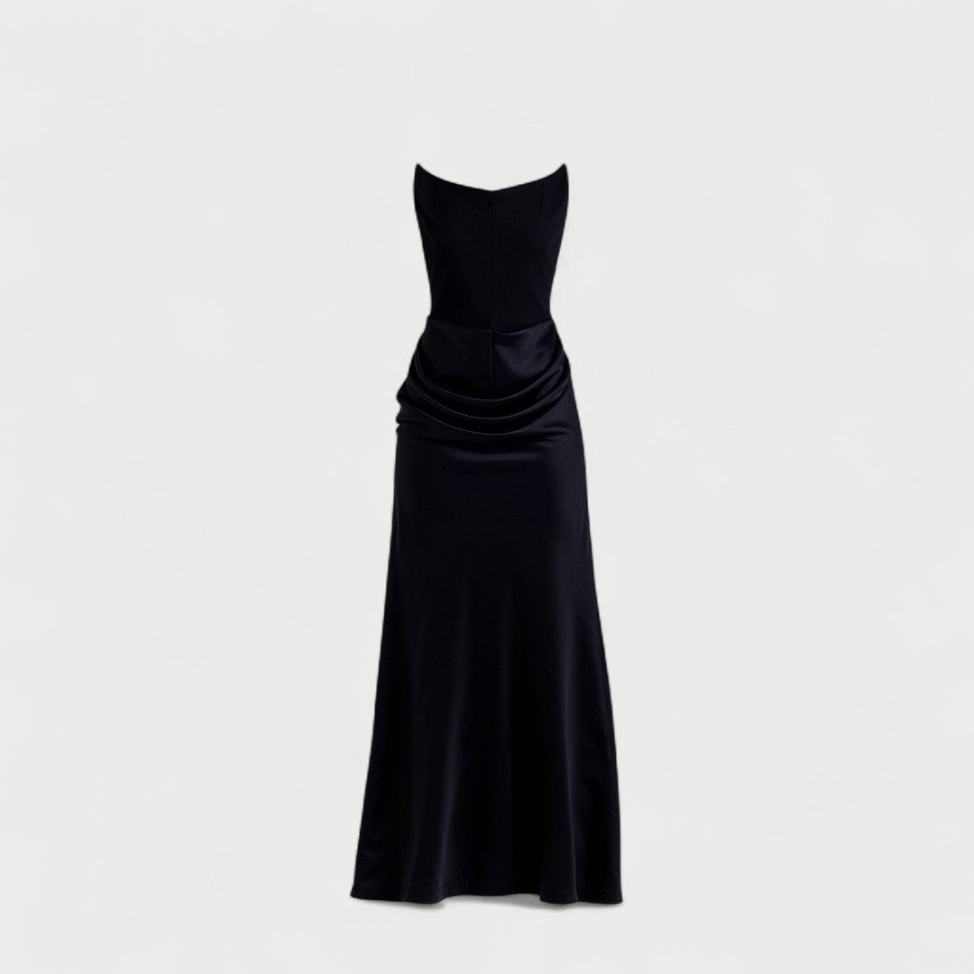 Obleka 'Radmila' predstavlja začasno eleganco v svoji najlepši različici. Ta dolga obleka s bustier stilom brez naramnic je izdelana iz mat materiala, ki nudi popolno osnovo, medtem ko umetniški naborek na bokih ustvarja zavidljive oblike.