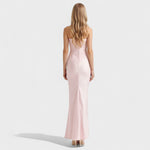 Prilagojena silhueta prehaja v subtilno širjenje ribjega repa iz sijočega satena, ki vsak korak naredi poseben.