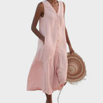 Odkrijte našo elegantno obleko brez rokavov, ki združuje udobje in stil. Z V-izrezom in gumbi spredaj nudi sproščen, a sofisticiran videz. Zračen kroj omogoča svobodo gibanja, medtem ko praktični žepe dodajajo funkcionalnost.