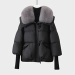 • Luksuzni ovratnik iz umetnega krzna: Mehka in voluminozna umetna krzna, ki vas ohranja tople in dodaja pridih elegance vaši obleki.
