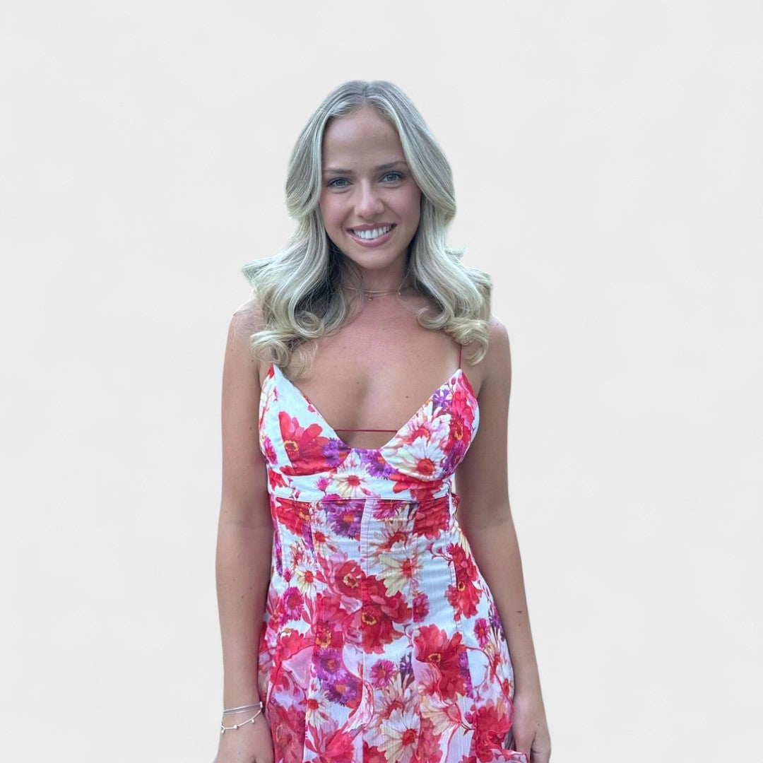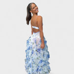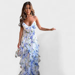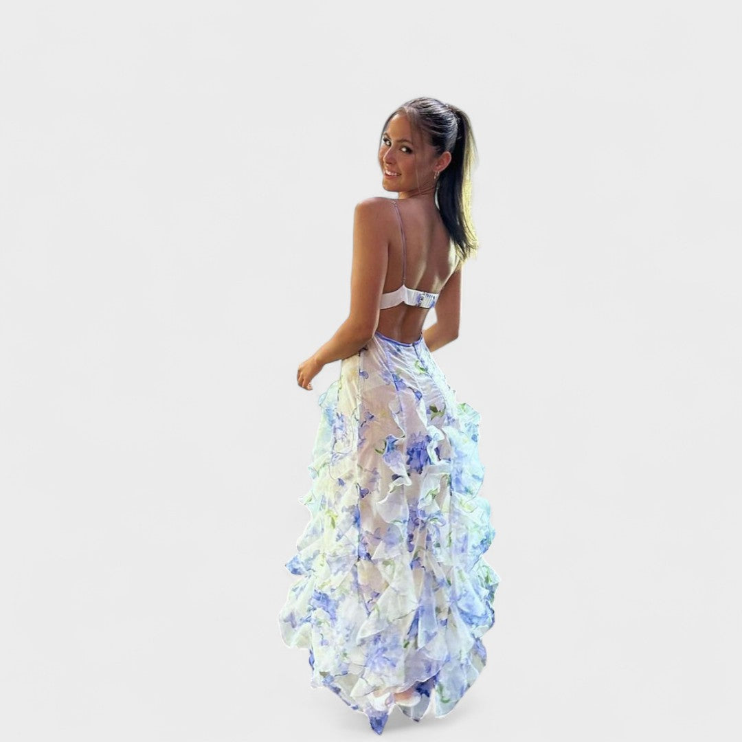 Dolga cvetna obleka z volani prinaša pridih sofisticiranosti in elegance v vsako priložnost. Ta obleka je idealna za svečane dogodke, praznovanja ali posebne trenutke, ko želite zasvetiti.