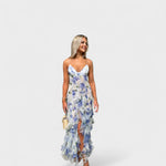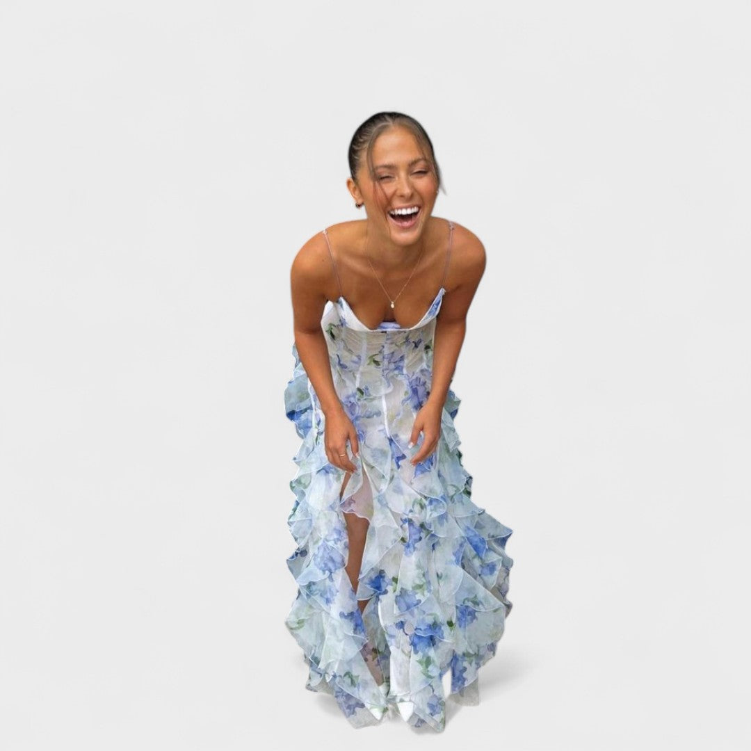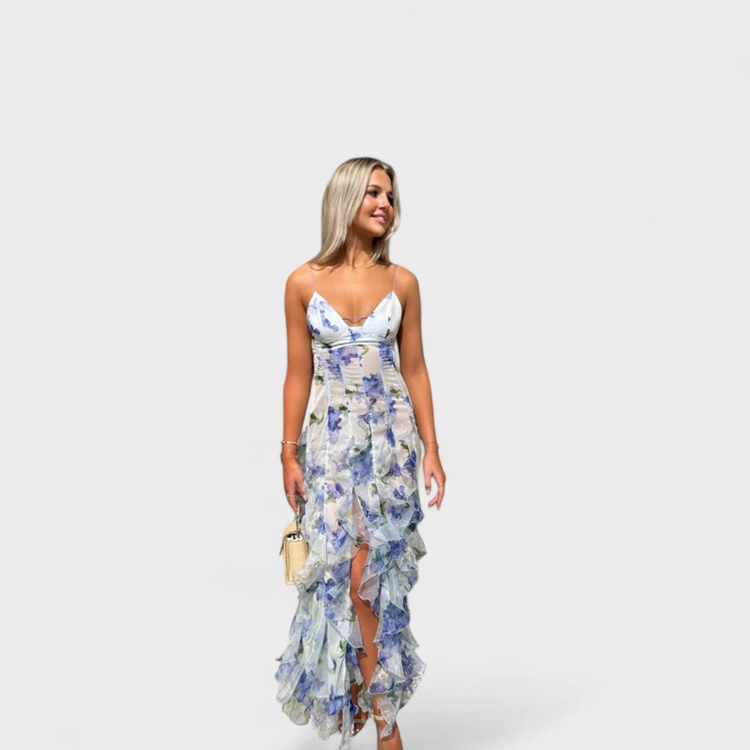 Mirjana - Dolga cvetna obleka s čipkastimi volani