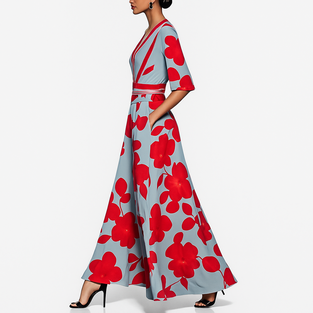 Odkrijte našo upečatljivo maxi obleko z globokim preklopnim V-izrezom in kimono rokavi, ki ustvarja rafinirano, podolgovato silhueto. Poudarjen pas definira vašo postavo, medtem ko razkošna, lepršava krila s sprednjim razporkom zagotavljajo dramatičen gib pri vsakem koraku.