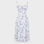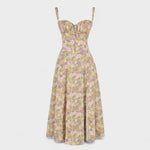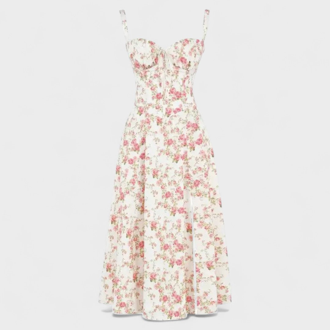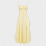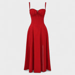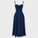 Odkrijte našo ženstveno midi obleko, ki se ponaša s popolnim krojem, ki poudarja silhueto in nudi prefinjen videz. Elegantni korzetni zgornji del z naramnicami in diskretnimi detajli prinaša sofiticiran vtis, medtem ko subtilen razporek dodaja pridih senzualnosti in svobode gibanja. Idealna je za posebne priložnosti, večerne izhode ali romantične trenutke, v katerih želite zasvetiti.